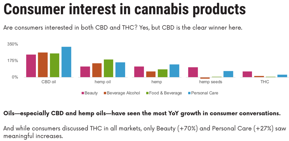 - In the beauty space, consumers are particularly interested in CBD for skincare as they’re looking for sustainable and clean products that treat inflammation and other skin issues.